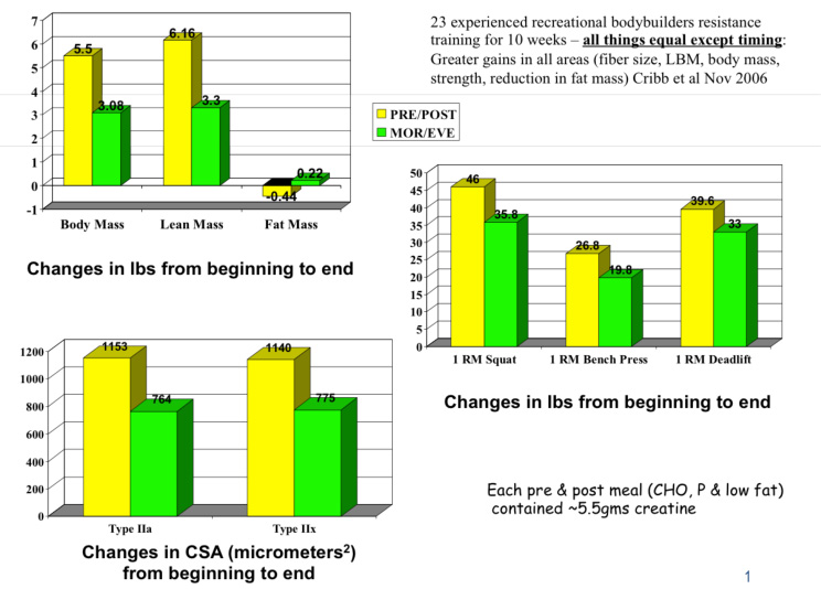 To summarize: the pre-drink (or appropriate bar) gives added training energy and minimizes muscle damage. The immediate post feeding increases all training outcomes that would otherwise not take place. Together these feedings have the potential to make you bigger, stronger faster following each workout when compared to without.