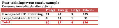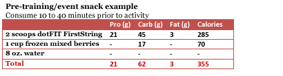 One serving (4-scoops) of FirstString contains 42 grams of the best quality proteins, and 86 grams of a perfect mixture of carbohydrates packed into 570 calories, making FirstString the perfect muscle gain/performance formula. FirstString can deliver exactly what’s needed to ensure the surplus calories are incorporated into muscle tissues rather than body fat when appropriate resistance exercise is included and total daily calories are appropriate (see pre/post shake mix examples below).Your personalized menus in your dotFIT Me Program will contain your ideal pre and post feedings. For shake recipe ideas click here and pick as desired but keep the amounts of protein, carbohydrates, as close as possible to the recommended numbers. Additionally if your venue makes using shakes difficult, feel free to substitute the dotFIT bars.