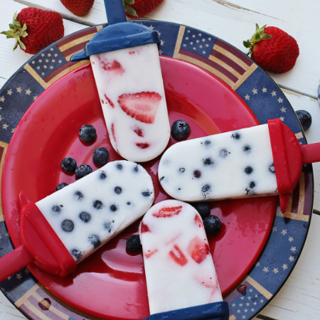 Blend your ingredients and pour into molds and add your favorite berries! We used blueberries and strawberries!